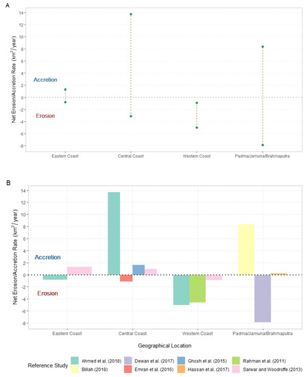 Net erosion and accretion rate (in square kilometer) per year. (A) represents the location-wise range of erosion/accretion rate. (B) demonstrates study and location-wise specific erosion/accretion rate [54,55,56,58,59,61,62,64].