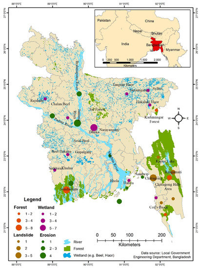 Geographical coverage of the research articles published on forest, wetland, erosion, and landslide related issues in Bangladesh.
