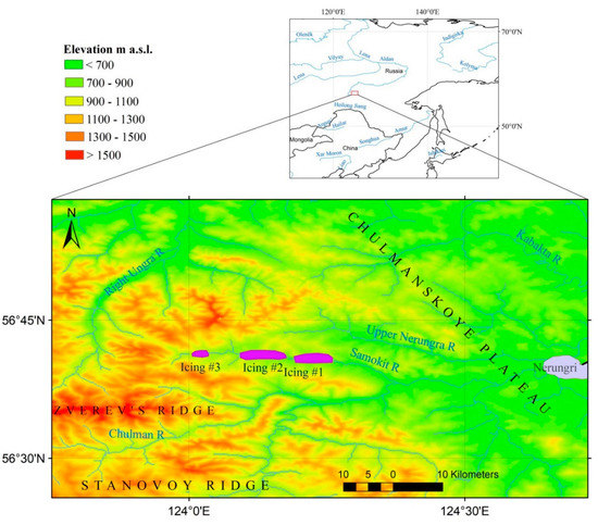 This study site was selected because its groundwater icings are typical and representative for the region, and also because several previous studies were performed in this valley, describing icing development and its contribution to streamflow [13,42]. Icing #2 was chosen from three major icings at the Samokit River valley bottom for the detailed field studies. Similar icing areas are known in Russia (e.g., Verkhoyansk Range, Sayan Mountains, and others), Alaska (Brooks Range), and Canada (British Mountains), though at different elevations [3,5,6,12,14,15].