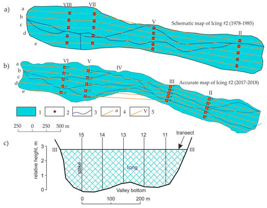 Icing #2 boundaries and staking profiles: (a) in 1978–1985 (compiled and revised from [42]); (b) in 2017 and 2018; (c) schematic icing cross-section of transect III. Legend: 1: icing area; 2: stake locations; 3: river channel; 4: profiles between icing cross-sections; 5: icing transects.