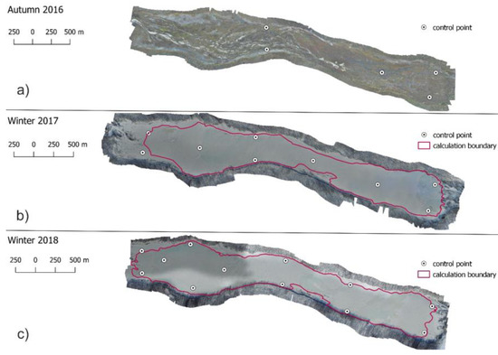 A digital surface model (DSM) and an orthomosaic with spatial resolution of 1.3 m/pixel were created for each survey date (Figure 3a–c). The ice-free DSM was further used as a reference, or subtraction, surface in icing volume calculations within the calculation boundary, i.e., within the actual icing areal extent on the survey date, from photogrammetric analysis.