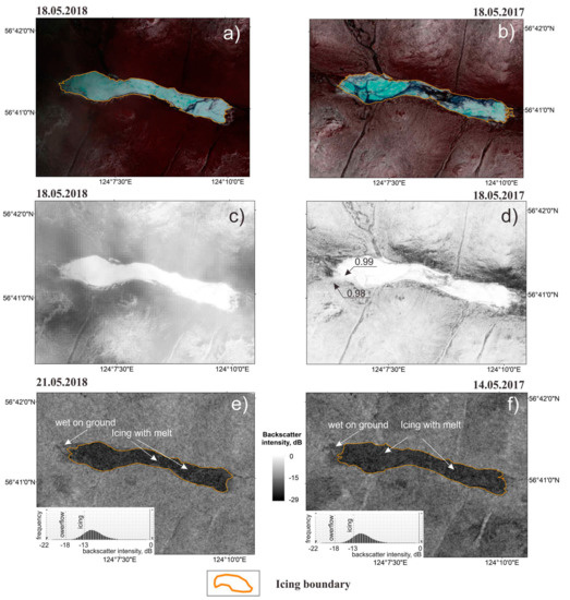 ESA Sentinel-1 SAR imagery (Figure 5c,d; Figure 6e,f) was used in extracting icing areal extent and detecting groundwater outpouring over the icing surface. The acquisitions closest to the field survey dates (late February) and to available Sentinel-2 images (mid-May) were downloaded and post-processed. These images were acquired in the interferometric wide swath mode (incidence angle range 20°–46°) with VV (vertical-to-vertical) and VH (vertical-to-horizontal) polarizations [49]. The spatial resolution of the raw SAR data is 5 m in range and 20 m in azimuth, over a 250 km wide swath. SAR post-processing was undertaken in three steps [37]: radiometric calibration, multitemporal speckle filtering, and range-Doppler terrain correction. Finally, both VV and VH data were transformed from unitless intensity to backscatter reflectance, dB. Previously, the threshold backscatter values for RADARSAT and European Remote-Sensing Satellites (ERS-1, 2), used in icing boundary tracking, were discussed [5]. In southern Yakutia, the corresponding threshold value was −13 dB, and overflow water at the icing surface ranged below −18 dB.