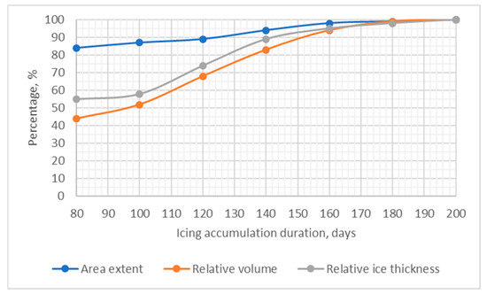 The first studies of the Samokit River icing morphometry and seasonal evolution were performed on Icing #1 by Sokolov in the mid-1960s [13]. His observations, employing staking technique, allowed documentation of temporal evolution of the icing, and based on these data, Multitemporal analysis of groundwater icing development, performed by Sokolov, led to two major conclusions. First, icing temporal evolution shows similar patterns regardless of geographical location. Icing area and volume at a given moment of time, expressed in relative values as percentage of annual maximum values, depend on the ice accumulation duration (Figure 7). This approach allows a first approximation of the annual maximum icing area and volume, using the values observed in the field at a given icing accumulation duration. In our case, by 25 February 2017 and 2018 the icing area was about 90%, average ice thickness, about 73%, and icing volume, about 64% of the annual maximum. These ratios may be further used to recalculate the annual maximum values of given icing morphology parameters.