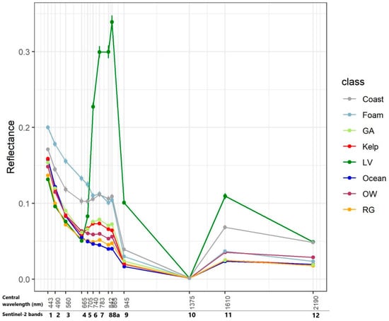 Mean ± SD reflectance values for each Region of Interest (ROI) used as training data in this study, computed for all Sentinel-2 bands (central wavelength of each band (in nm) and band number indicated in the × axis). Classes or ROIs: Coast; Foam; GA = Green Algae; Kelp; LV = Land vegetation; Ocean; OW = Organic water; RG: River grass.