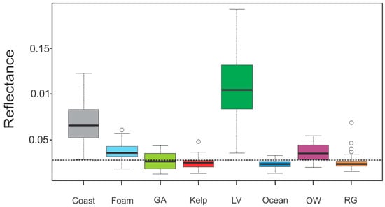 Figure 2. Box and whisker plot of B11 reflectance values (90 grid cells per class). All grid cells with B11 ≥ 0.028 (indicated with a dashed line) were masked out to separate Coast and Land Vegetation from the other ROIs. Classes or ROIs: Coast; Foam; GA = Green Algae; Kelp; LV = Land vegetation; Ocean; OW = Organic water; RG: River grass. - Kelp Difference (KD). Giant kelp grid cells exhibited a conspicuous large difference in reflectance between bands in the red edge area of the spectrum (Bands 5, 6 and 7) and the red band (B4). Selecting B6 (central wavelength = 740 nm) as the band with the largest difference with B4 (Figure 1), we defined a Kelp Difference (KD) as the difference between both band values. Step 2 was applied after the band-based masking (Step 1), although the order of these two steps would not alter the result: