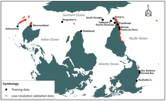 Location of the training data (black dots) and the low-resolution validation sites (red dots). Cartographic projection EPSG: 54042. Maps in this article are south-oriented to highlight the connectivity of giant kelp forests at sub-Antarctic latitudes.