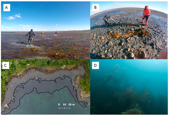 (A) Buque Quemado intertidal forest (Strait of Magellan) at 10 cm of depth in low tide and 9 m in high tide. (B) Measuring the length of the plants of site A. (The people in photos A and B are included for scale.) (C) A permanent subtidal forest (delineated in black) in Puerto Amparo (area = 0.3 ha). (D) The underwater canopies of Puerto Amparo (max. depth: 7.9 m). (Photos: Alejandra Mora S.).