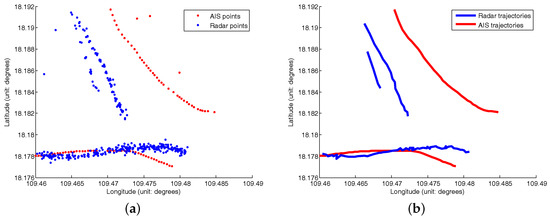 AIS points and radar points can be displayed in figure according to their latitude and longitude. For example, in Figure 1a, the red points represent AIS points and the blue points represent radar points. In Figure 1, the horizontal axis represents longitude, and the vertical axis represents latitude. The units of longitude and latitude are degrees. The X and Y values of each red point represent the longitude and latitude of a certain ship at a certain moment provided by AIS device, respectively, and the X value and Y value of each blue point represent the longitude and latitude of a certain target (in most cases the target is a ship), respectively, at a certain moment provided by radar. Figure 1a shows latitudes and longitudes of targets provided by AIS and radar in a certain spatiotemporal range. Among them, the longitude range is [109.4600, 109.4848], the latitude range is [18.1770, 18.1917], and the time range is from 09:48:22 on 4 January 2017 to 12:02:23 on 4 January 2017.