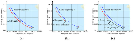 Figure 2a shows normal navigation of the ship, where radar trajectory 0 is the ship’s trajectory detected by radar, and AIS trajectory 0 is the ship’s trajectory received by AIS receiver. Figure 2b shows the AIS closing behavior during navigation. After the AIS device of the ship is closed, the AIS receiver cannot receive the data transmitted by the ship, the AIS trajectory is interrupted, as shown by AIS trajectory 0 in Figure 2b, the radar can still detect the ship that is sailing, and the radar trajectory continues to be generated, as shown by radar trajectory 0 in Figure 2b. Figure 2c shows the MMSI spoofing behavior during navigation. As the ship’s MMSI has been changed, two AIS trajectories are generated during the ship’s navigation, as shown by AIS trajectory 0 and AIS trajectory 1 in Figure 2c, the MMSI spoofing behavior has no effect on the radar, the trajectory detected by the radar is still the actual trajectory of the ship, as shown by radar trajectory 0 in Figure 2c. Through the analysis of AIS closing behavior and MMSI spoofing behavior, we find that it is difficult to detect the above two behaviors only by using AIS data; however, this problem can be solved by comparing radar trajectory with the associated AIS trajectory.