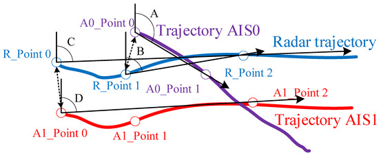 To avoid the influence of detection error, the Direction of a TRajectory At a certain Point (D-TRAP) is defined as the direction of the vector from the first point successfully associated in the trajectory to the certain point. When determining whether the trajectory point is the associated point of point P in trajectory , the D-TRAP of at P needs to be computed, and the formula can be expressed as . In the paper, D-TRAP is computed when determining whether two trajectory points are associated, that is, D-TRAP occurs in pairs. To improve the accuracy, when computing the D-TRAP value of trajectory at point P, in addition to and P, the point to be compared with P also needs to be considered. According to , the trajectory to which it belongs can be obtained, is the first point associated with in , the angle of clockwise rotation from the north direction to the vector is the D-TRAP value of at P when compared with . For example, in Figure 3, the associated point of is , and the associated point of is . Next, the associated point of needs to be found. When judging whether is its associated point, first the direction of trajectory AIS0 at needs to be computed, the first point associated with the radar trajectory in trajectory AIS0 is , the direction of the vector from to is the direction of trajectory AIS0 at , this direction is represented by the angle of clockwise rotation from the north direction to the vector, as indicated by angle A in Figure 3. Then, the direction of the radar trajectory at at this time needs to be computed, as to be judged belongs to trajectory AIS0, and the first point associated with trajectory AIS0 in the radar trajectory is , the direction of the vector from to is the direction of the radar trajectory at at this time, as indicated by angle B in Figure 3, angle A and angle B are significantly different, so is not the associated point of .