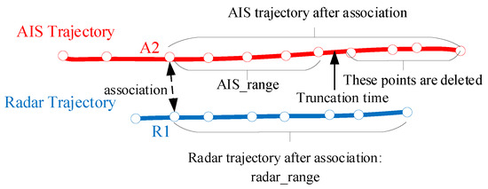 In the experiment, AIS closing behavior should be simulated. Due to the limitation of radar detection capability, on the one hand, the AIS trajectory often lasts for a period of time before it is associated with the radar trajectory, as the lack of associated relationship, the trajectories before association are meaningless to our research, therefore, only the trajectories after association are studied, as shown in Figure 5; on the other hand, when the ship is sailing normally, the range of the primary associated AIS trajectory after association is larger than the range of the radar trajectory after association, that is, there is no AIS closing behavior. Therefore, to simulate the AIS closing behavior, the primary associated AIS trajectory needs to be truncated, that is, the ship closes the AIS device at the truncation time of the AIS trajectory. Truncation ratio is expressed by , , among them, is the range of the radar trajectory after association and is the range of the AIS trajectory between association and the truncation time, as shown in Figure 5. The AIS trajectory points after truncation time are deleted, so that the AIS closing behavior is simulated, and by changing the value of , the behavior of the ship closing the AIS device at different times can be simulated. The simulation steps are as follows.