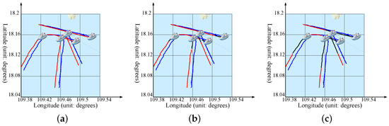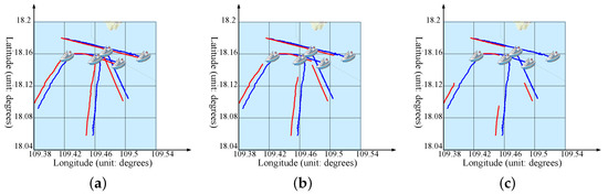 The steps for simulating MMSI spoofing behavior are similar to the steps for simulating AIS closing behavior, except that the last step is different. In the simulation program, instead of deleting the points in the AIS trajectory later than , the trajectory ID to which these trajectory points belong is updated to a new trajectory ID, In other words, the ship performed MMSI spoofing at , and the AIS points after generated a new AIS trajectory. Similarly, in this experiment, we also set to 95%, 90%, 85%, 80%, 75%, 70%, 65%, 60%, 55%, 50%, 45%, 40%, 35%, 30%, 25%, 20%, 15%, 10%, and 5%, respectively, to simulate the MMSI spoofing behavior of the ship at different times. The effect of simulating MMSI spoofing behavior is shown in Figure 8, the blue lines are radar trajectories, the red lines are the AIS trajectories before MMSI spoofing, and the black lines are the AIS trajectories after MMSI spoofing, for the convenience of explanation, the trajectories in Figure 8 are the trajectories that can be effectively associated. Figure 8a shows the AIS trajectories and radar trajectories of ships during normal navigation. Figure 8b shows the radar trajectories and the AIS trajectories before and after MMSI spoofing when is 80%. At this time, the range of the AIS trajectory before MMSI spoofing is less than 80% of the range of the corresponding radar trajectory, that is, the ship performs the MMSI spoofing behavior when the range of the AIS trajectory is about to reach 80% of the range of the corresponding radar trajectory, and a new AIS trajectory is generated based on the AIS points after MMSI spoofing. Figure 8c shows the radar trajectories and the AIS trajectories before and after MMSI spoofing when is 40%. The figures of other truncation ratios are not listed here.