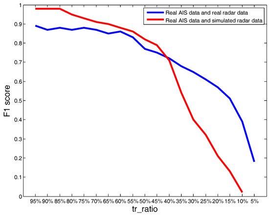 As can be seen from Table 2 and Figure 9, in the first dataset containing real AIS data and real radar data, when is between 65% and 25%, the F1 scores are all greater than 0.8, and the algorithm has good performance. When is greater than 65%, the F1 score of the algorithm decreases as increases, and when is less than 25%, the F1 score decreases as decreases. In the second dataset containing real AIS data and simulated radar data, the F1 score of the algorithm has a similar trend.