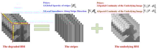 where , and indicate the degraded image, the unknown clean image, and stripes, respectively. Moreover, h and v indicate the horizontal and vertical pixel numbers in spatial domain, and b represents the number of spectral bands.
