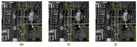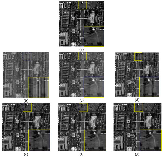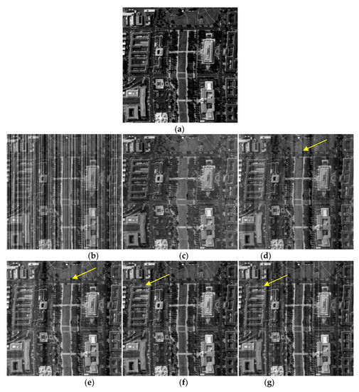(a) Visual effect comparison: To evaluate the destriping effectiveness of GLTSA, we simulated many degraded cases. We selected one representative band of WDCM to show the destriping results. The original images are presented in Figure 5a and Figure 6a, and the images are degraded by periodic stripes (I = 60, r = 0.8) and non-periodic stripes (I = 60, r = 0.4) are listed in Figure 5b and Figure 6b, respectively. The destriping results obtained by different methods are illustrated in Figure 5c–j and Figure 6c–j, where significant differences in visual quality can be observed.