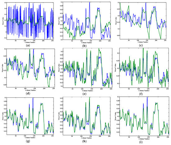 (b) Qualitative Assessment: For the evaluation of GLTSA, we adopt the mean cross-track profile (MCTP) to compare the performance. The curves in Figure 7 and Figure 8 represent the MCTPs of Figure 5 and Figure 6, respectively. The horizontal axis indicates the column number, while the vertical axis denotes the mean digital number value of each column. The existence of stripes results in rapid fluctuations (blue curve) in Figure 7a; the stripes are more or less suppressed by the eight methods as shown in Figure 7b–i. From Figure 7b–d, we can see that UTV, WFAF, and SGE methods fail to restore original MCTP (green curve). There are still fluctuations in Figure 7e,f. This indicates that the images estimated by these methods are distorted or blurred. Although the profiles produced by DL0S and LRTD are better than other methods, the MCTP of GLTSA is closer to the original, showing no difference with the results listed in Figure 5. A similar case is shown in Figure 8.