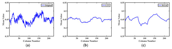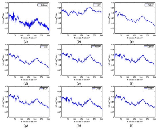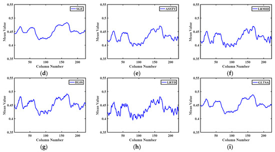 The MCTPs of Figure 9 and Figure 10 are shown in Figure 11 and Figure 12, respectively. The MCTP of the Urban data is shown in Figure 11a, while Figure 11b–i shows the MCTPs of the compared methods. The profiles of LRMID and LRTD have obvious fluctuations, which indicate residual stripes, and the profiles of WFAF and UTV show over-smoothing, which suggests details are lost. Figure 11i indicates that GLTSA can realize the desired result, while keeping more details.