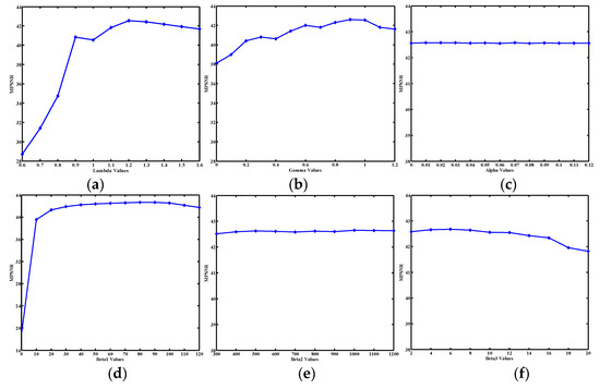 The function curve of MPSNR values and the regularization parameters, , is plotted in Figure 13a; the results show that, when λ increases from 0.6 to 1.2, the MPSNR is obviously improved, and then the MPSNR reduces slightly when is further increased. That is to say, the highest MPSNR value of is reached near 1.2. The function curve of MPSNR values with parameter is listed in Figure 13b. With the increase of , the highest MPSNR value is reached near 1. It shows similar trends as . Since there are many degradation scenarios in our implementation, the parameters are not fixed; they are varied in the [1.1, 1.3] range for and [0.8, 1] for . The relationship between MPSNR and the parameter is depicted in Figure 13c. It is observed that MPSNR does not change much with the change of . This means that the GLTSA is robust with . In fact, the image with severe stripes will prefer a larger but a lower . The value of is fixed within the range of [10–5, 10–4].