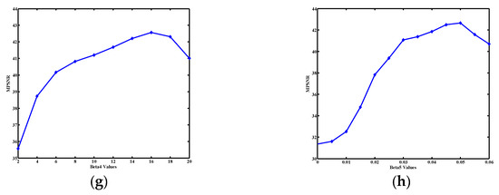 The MPSNR curves as function of the regularization parameters. The relationship between MPSNR and the parameters (a) ; (b) ; (c) ; (d) ; (e) ; (f) ; (g) ; (h) .
