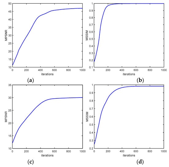 Figure 14 shows the relationship between the MPSNR and MSSIM values and the number of iterations of the GLTSA solver. Figure 14a,b is the periodic situations with (r = 0.5, I = 100), Figure 14c,d is the non-periodic situations with (r = 0.9, I = 60). As the iterations go on, GLTSA converges as relative changes of MPSNR and MSSIM converge to zero.