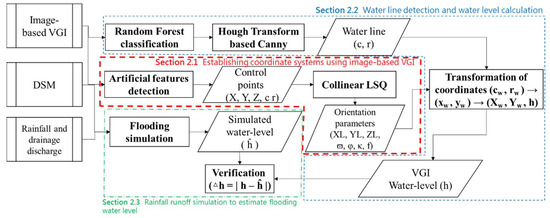 The proposed water level detection using VGI involves two processes: identifying water lines in an image-based VGI and measuring the water level based on photogrammetric principles (i.e., collinearity equations). A schematic is presented in Figure 1.