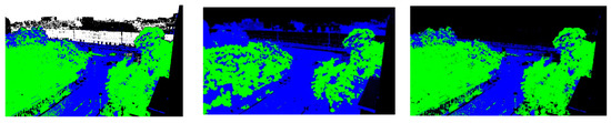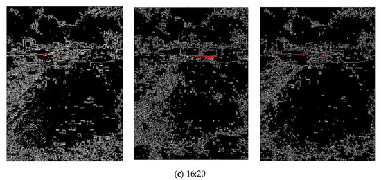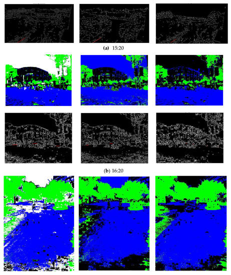 In this study, RF, maximum likelihood (ML), and support vector machine (SVM) classification were used to identify three classes (vegetation, water, and building) in the image-based VGI. A total of 26,933 pixels were selected for all three classes through equalized random sampling, divided into 13,000 pixels as a training set and 13,933 pixels as a test set. Regarding the RF parameter settings, three classified features at each node and 60 trees were used. Table 1 shows the percentages of producer’s and user’s accuracy, F1 score, overall accuracy, and kappa statistic for three classification categories at three times. The results of RF classification are the best with overall accuracies are 80.10% (15:20), 80.12% (16:10), and 79.93% (16:20), respectively. The average overall accuracy of the test data is 80.05%. Kappa coefficient values are 70.03% (15:20), 70.11% (16:10), and 68.80% (16:20), respectively. In the classified image-based VGI, vegetation appears in green, water areas in blue, and buildings in black. The edges of water lines detected using HT-Canny were marked as red lines; their positions in each digital photo coordinate system were calculated (Figure 6).