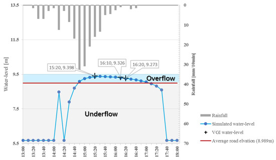 The rainfall hyetograph and simulated water level are shown in Figure 7, and the simulated flooding process from 14:30 to 17:40 is shown in Figure 8. The simulation analysis confirmed that the significant water level of 9.252 m was reached at 15:00, and the flood area was located on the trunk road. At 15:20, the peak water level of 9.353 m was reached, and the flood spread over all roads in the study area. By 16:30, the flood had gradually receded, and the water level decreased to 8.586 m. Finally, at 17:40, the flooding event ended.