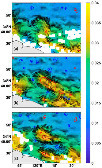 - Kim, S.Y. Observations of submesoscale eddies using high-frequency radar-derived kinematic and dynamic quantities. Cont. Shelf Res. 2010, 30, 1639–1655. [Google Scholar] [CrossRef]