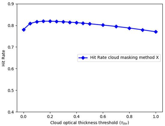 In the ideal case, the method would then perfectly reproduce this restricted cloud mask and achieve the highest possible HR value, HR = 1.0, at this particular τthr. However, in reality, peak HR values seldom exceed 0.9. Notice also that if Equation (5) is valid (or approximately valid), it means that we have not only found that particular CALIOP cloud mask, which is best reproduced by our method. We have also ensured that a cloud probability threshold of 50% is always applicable over this particular Earth surface to create a binary cloud mask (which is required by many applications) to get optimal results. The latter is a consequence of the meaning of the peak in the HR curve in Figure 1 and the assumption of a monotonously increasing POD as a function of cloud layer optical thickness τ. Notably, in this context, a 50% cloud probability threshold has also been used to validate the cloud mask (i.e., for computing the HR-value) during this iterative process.