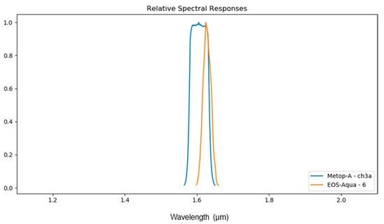 The main problem here is that, due to condition 1 above, we cannot train our method efficiently over dry surfaces (i.e., deserts and other regions with sparse vegetation) where we know that this channel measures high surface reflectances, which may be confused with cloud reflectances for some type of clouds. However, another sensor operating in a polar orbit similar to NOAA and Metop satellites and measuring in this spectral band is the MODIS sensor. Furthermore, if we restrict our interest to the MODIS sensor on the Aqua satellite (officially known as the EOS PM-1 satellite), we find that MODIS measurements are already closely tied to the CALIPSO orbit in the A-train constellation. Matchup conditions are excellent with an approximate 1-min time difference between the MODIS and CALIOP observation. It is also clear that the spectral response functions for this channel on the AVHRR and MODIS sensors are quite similar (Figure 2). Even though they are not identical, they are both well within a region with high atmospheric transmissivity (atmospheric window) in the spectral region 1.5–1.8 µm [27], which means that only surfaces with rapidly changing spectral reflectances may differ noticeably in appearance in the two channels. Consequently, we have assumed that MODIS measurements can reasonably well represent AVHRR measurements in this channel and we have collocated MODIS with CALIPSO-CALIOP data for the global training of the spectral signatures associated with this particular channel (i.e., linked to feature Rswir_3a in Table 3).