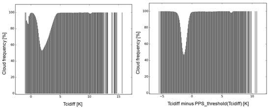 Cloud occurrence (or cloud frequency) histograms as a function of the original Tcidiff feature (left) compared to the case of a reformulated Tcidiff feature formed as a difference to the PPS threshold (right). The histograms are valid at night over tropical ocean surfaces. The Tcidiff value on the x-axis in the left figure is positive when brightness temperatures at 11 µm are larger (warmer) than at 12 µm. See text for further explanation.