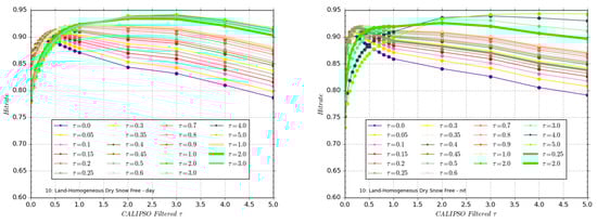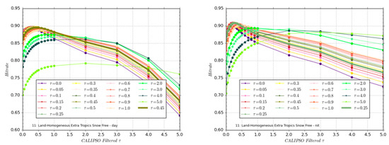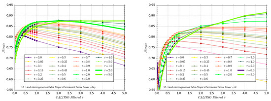 A more in-depth investigation of the results presented in Figure 4, Figure 5, Figure 6, Figure 7 and Figure 8 in Section 3.1 also indicates this effect for the new cloud screening method. In some of these figures, the results when training with unfiltered CALIOP data (blue curve for τ = 0.0) yielded higher HR values for the unfiltered case (at CALIPSO Filtered τ = 0.0) than the selected results based on curves with optimal CDS values. These details are hard to see in the current figures (because of too many overlaid curves) but appear in a close-up of results in Figure 5 valid over tropical ocean surfaces at night. Table 9 lists achieved HR scores for this case when training our method using the five largest CALIOP cloud masks, i.e., original cloud masks being thresholded at optical thicknesses 0.0, 0.05, 0.10, 0.15, and 0.20. According to Figure 5, we get the highest HR values when validating with a restricted CALIOP cloud mask with τthr = 0.1 (which is then our selected CDS value). The three rightmost columns in Table 9 give corresponding HR scores when validating with restricted CALIOP cloud masks thresholded at optical thicknesses 0.0, 0.05, and 0.10. We recognize the maximum HR value of 0.874 for the peak seen in Figure 5 for τthr = 0.1. However, we notice that we actually fulfill the CDS criterion in Equation (5) also for τthr = 0.0 and τthr = 0.05. The reason for selecting CDS to be 0.10 is that resulting HR scores are higher here than for the two mentioned alternatives. Thus, for CDS set to 0.10, we have the best representation or reproduction of the CALIOP cloud mask in AVHRR imagery. We also claim that the CDS alternative 0.0 is theoretically problematic since it suggests that the unfiltered CALIOP cloud mask is better reproduced than any other filtered CALIOP cloud mask. This violates the generally accepted fact that the CALIOP measurements are more sensitive to thin clouds than AVHRR. We have rejected this possibility and interpreted it as an effect of statistical overfitting.