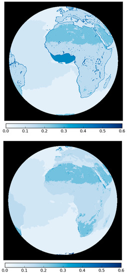 Although we still claim that there must be a straightforward relationship between a cloud’s optical thickness and the capability of detecting it over a specific surface type, the success of this particular method depends on whether the defined surface categories can be considered homogeneous (i.e., reasonably invariant) or not. The majority of Earth’s surfaces fulfill this condition, especially over every oceanic surface and many land surfaces at low and middle latitudes, where the method works quite efficiently. The exceptions are found over high latitude land surfaces and in the Polar Regions. Here, the idealized model for optimal cloud detection (as outlined in Section 2.4 and Section 2.5) does not seem to be fully applicable. Therefore, as a consequence, solution compromises were necessary (e.g., see discussion related to Figure 8 in Section 3.1).