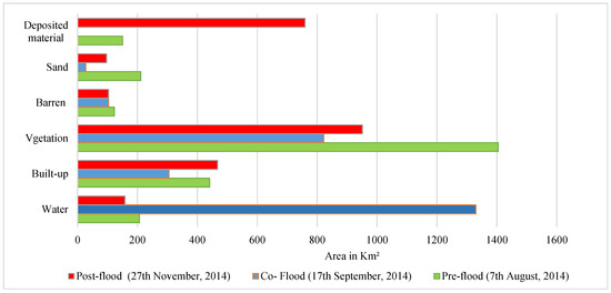 | Classes | Pre-Flood Classified Image (7 August 2014) | Co-Flood Classified Image (17 September 2014) | Post-Flood Classified Image (17 September 2014) | |||||||||