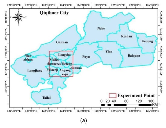 Study areas at (a) Qiqihaer City and (b) the Xiong’an New Area.
