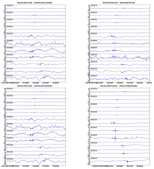 Records of infrasonic pressure data for 10 March 2018, at 01:54 Japan standard time (JST) (top-left), 04:27 JST (top-right), 10:15 JST (bottom-left), and 18:11 JST (bottom-right), showing the arrival times of air pressure disturbances for stations on Shikoku Island following the Mt. Shinmoedake eruption on 10 March 2018. The x-axis is the observation time in UTC, and the y-axis is the infrasonic pressure in Pa.