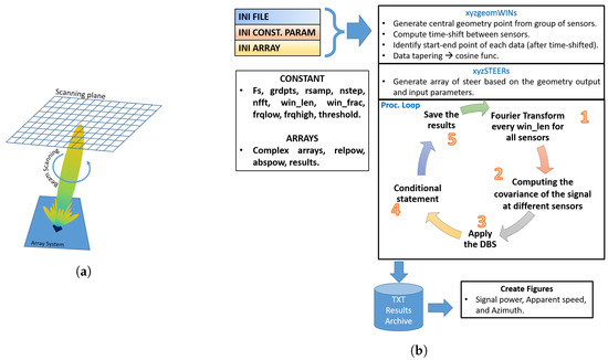 The illustration of the approach used in this study. (a) The idea behind Radar Beam Swinging in steering the beam of the array on a scanning plane to detect a suspected source waves. (b) Schematic illustrating the steps in our approach to determine the arrival direction and propagation speed of the incoming signal’s source.