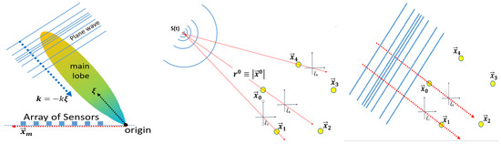 The phase center of the array is the origin of a coordinate system. denote as a source location emits a signal s(t) that propagates to the array in a particular direction . The distance between the origin and the source is . (Left) Illustration of sensor array, the direction represented by a main lobe and a plane wave incident from direction of the main lobe. (Right) The illustration for far-field propagation, the apparent direction of propagation does not vary with sensor location.