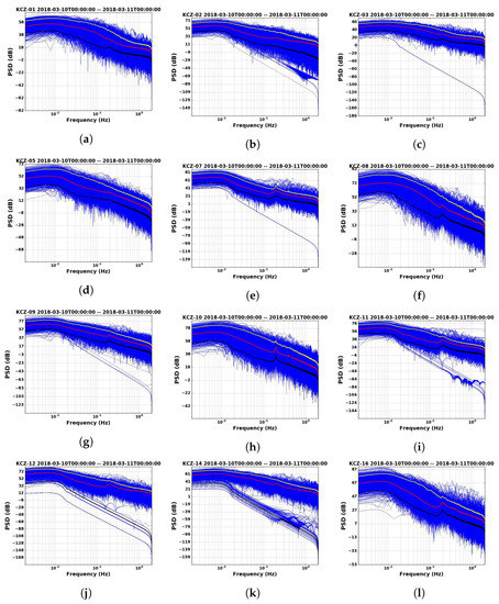A set of power spectral density (PSD) plots for stationson Shikoku Island during a one-day period on 10 March 2018 (blue). The 5th and 95th percentiles (black and red) and the median (white) for each plot. Figure (a–l) show the PSD results of the one-day signals recorded by sensor KUT01, KUT02, KUT03, KUT05, KUT07, KUT08, KUT09, KUT10, KUT11, KUT12, KUT14, and KUT16, respectively.