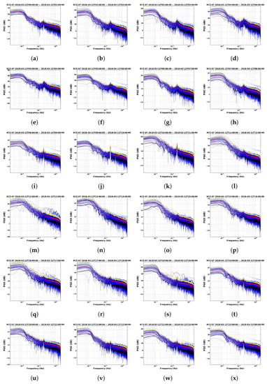 Power spectral density (PSD) for station KUT07 on 12 March 2018 for all time intervals (blue), the 5th and 95th percentiles (yellow and black), and the median (white) value for each time interval. The rows group plots by 1-h time intervals for 4 h. Figure (a–x) respectively show the PSD results of the one-hour signals recorded by sensor KUT07.