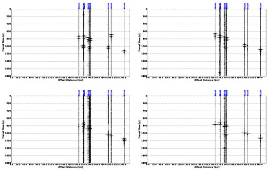 Records of the Mt. Shinmoedake eruptions on 10 March 2018, at 01:54 JST (top-left), 04:27 JST (top-right), 10:15 JST (bottom-left), and 18:11 JST (bottom-right), from the stations on Shikoku Island. The results are filtered in the frequency range 1.0–1.5 Hz based on the PDF plot shown in Figure 4.