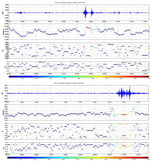 We conducted an analysis of infrasonic data regarding the suspected signatures of an infrasonic pressure disturbance, which was likely to have been caused by an explosive eruption of Mt. Shinmoedake in Japan during the time period listed in Table 2. Specifically, we evaluated individual infrasound data from various stations to identify the characteristics of a particular wave, mostly in terms of its strength, arrival angle, and propagation speed.