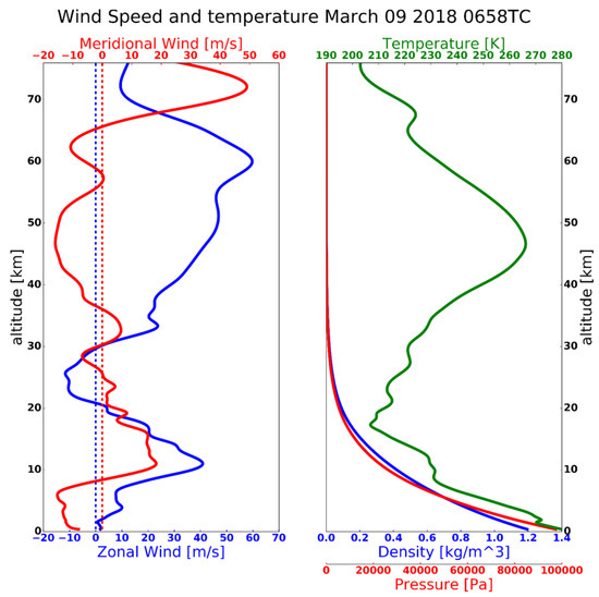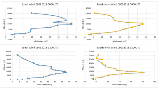Figure 17 shows a typical result of radiosonde observation on 9 March 2018 at 00:00 UTC and 12:00 UTC above Shinomisaki station, Japan (33.45°N, 135.77°E). The observation data can be accessed from the JMA database [50] and NOAA (National Oceanic and Atmospheric Administration) [51]. The jet stream in the troposphere, around 10 km of altitude flows strongly in the northeast direction as similar as the MERRA-2 model shown in Figure 11.