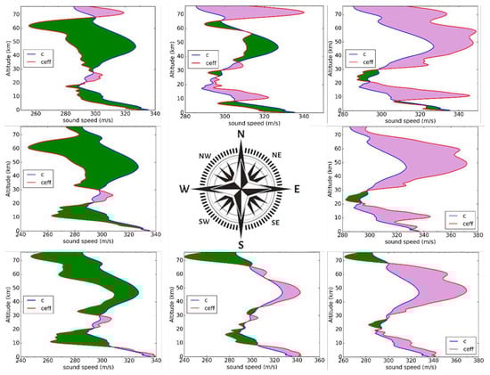 By incorporating the calculated horizontal wind components and vertical atmospheric parameters from the models (see Figure 11), upper altitude reflections of infrasound sources from the north to the east were obtained, as shown in Figure 12. According to the classical ray theory, strong arrivals (totally ducted) were refracted from altitudes for which the effective sound speed was larger than the adiabatic sound speed at the source level (purple shaded color). Figure 12 shows that, for northern propagation, the ducting layer was formed at altitudes above 60 km, although the effective speed of sound at the height of 10 km (see Figure 12) appeared to be greater than the adiabatic sound speed and was a possible candidate for the ducting process; however, the index of the sound speed ratio was not sufficient to form a ducting layer due to the weak meridional component at this height. In the east and northeast propagation, shown in Figure 12, infrasound waves were refracted back to the ground by two different layers, at 40 and 10 km (for eastward propagation) and above 45 and 10 km (for northeast propagation). The eastward and northeastward propagations had three dominant sound speed ratios, which occurred at altitudes around 10 and 40 km. Both profiles had the same index ratio at an altitude of 10 km, but at altitudes above 40 km, they began to show different behaviors in each direction of propagation. For the eastward direction in Figure 13, in addition to being deflected at an altitude of 10 km, the infrasound wave was guided back to the ground at an altitude of 40 km and less of the wave energy propagated to the higher altitude. This was presumably because the index of the two sound speed ratios at an altitude of 40 km in the profile of eastward propagation was significant enough to produce a ducting layer that could guide the wave back to the ground. Infrasound wave energy could possibly have a bias for the upper layer when the index of the two sound speed ratios at a lower altitude was not sufficient to trigger the ducting process, as seen in the east and northeastward propagation profile and clearly in the relationship shown in Figure 12 for similar propagation directions.