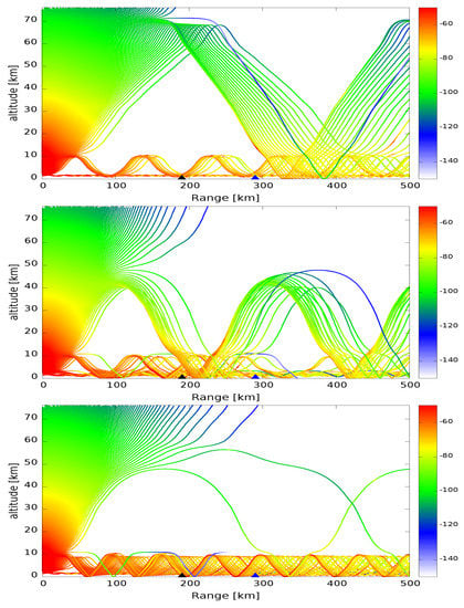 Ray tracing plot for the power transmission from Mt. Shinmoedake at 0 km at the left edge of the plot out to 500 km. The plot was constructed using atmospheric data for 9 March 2018, at 04:30 UTC. The top, middle, and bottom figures show the results for the northward, eastward, and northeastward propagation directions, respectively. The color plot represents the sound wave power transmission in dB per km of propagation of the infrasonic wave at a frequency of 1.25 Hz.