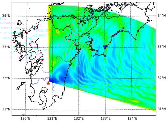 In the case of the Mt. Shinmoedake explosion on 9 March 2018, the rays intersecting an area of radius ∼500 km, centered on the source point (marked by the red triangle), were selected to construct a power transmission map (Figure 14). The color code shows the intensity of the power strength at the arrival of the infrasound for each area of the grid. This figure shows the effect of the wind jet corresponding to the background condition of the vertical atmosphere above the source, with the blue colors indicating higher observed amplitudes. As expected, waves propagated over a large area to the northeast of the volcanic region as a potential infrasound source, thus defining a large possible source area. At the time of the eruption, the strong zonal wind blowing toward the northeast would limit the detection of sources west of the volcano. The intensity of the partial strength (blue) repeated itself in concentric bands, resulting from some dominant deflection to the ground. Fortunately, several infrasonic stations detected signature signals from volcanic eruptions, with two phases arriving from the stratosphere and troposphere. The arrival of tropospheric infrasonic waves dominated the signal reception in the first station group, while the stratospheric arrivals were received at the second station group. In addition, the attenuation was very high, with a high absorption power estimated to the south and west after ∼300 km from the source point. In other situations, although the northeast propagation generally dominated, a small number of our sensors in the eastern part of Shikoku Island detected the event.