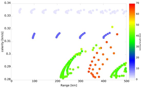Celerity-range diagram. The colored dots represent troposphere and stratosphere ducting according to the turning height.