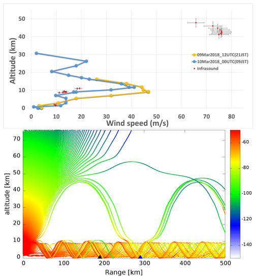 Two dubiety were found in the approach of atmospheric wind estimation, and one was the exact turning altitude to be estimated and the temperature at this altitude to also be obtained. The altitude level of reflection was estimated by the procedure described in Reference [44] and implemented in the acoustic ray tracing model [36], including the possibility of atmospheric wind, and three fundamental atmospheric profiles, retrieved from MERRA-2 and NRLMSISE-00 models for corresponding time periods above the source location. By applying the initial winds and temperature during the events into the acoustic ray tracing model, the level of infrasonic reflection in a real azimuth propagation from the source are obtained as given in the ray plot (Figure 16, bottom). Rays are plotted at 1° intervals of incidence angles. The stratospheric reflection at about 46 km as a result of the stratospheric jet stream at that time. The rays with lower angles of incidence were not reflected back to the ground which is probably due to the dissipation effects that attenuate the signal.