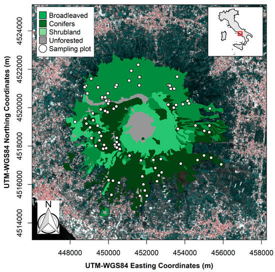 The Vesuvius National Park covers a surface of ~8000 ha, of which 3800 ha is forested, surrounded by a densely urbanized area (Figure 1). The iconic landmark of Vesuvius, with its asymmetric truncated cone-like structure, is the only stratovolcano still active on mainland Europe [32]. On its steep flanks, the soil is depthless and lava rocks frequently appear on the surface, although at lower elevations the soil of the anthropogenic terraces is about 2 m deep [33]. This substrate corresponds pedologically to a sandy, gravel-rich andosol derived from unconsolidated pyroclastic deposits [34,35].