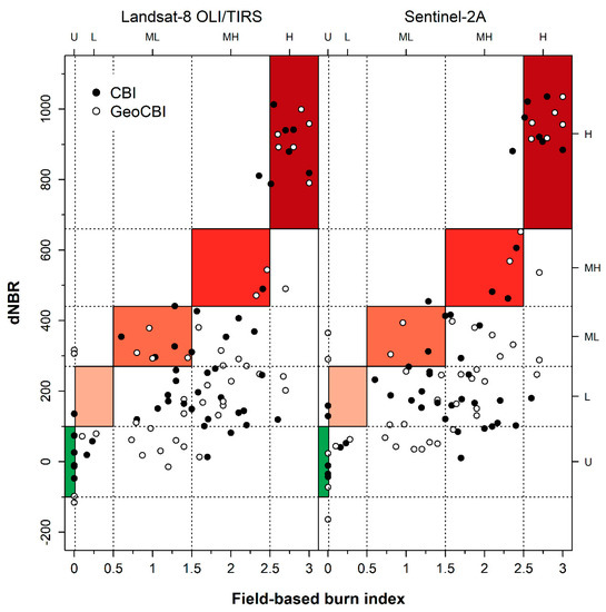 Relationship between satellite-derived (Landsat-8 OLI and Sentinel 2A MSI in the left and right panels, respectively), differentiated normalized burn ratio (dNBR) and field-based composite burn index (white circle—CBI; black circle—GeoCBI). Both left and bottom axis values are plotted on a continuous scale number. Colored square boxes represent burn severity class ranges corresponding to USDA and field-based burn index thresholds. On the top and right axes, the discretized burn severity classes are plotted, respectively, for the field-based burn index and satellite-based dNBR metric. Dotted lines indicate threshold values for each of the two burn index metrics. Burn severity class codes U, L, ML, MH, and H correspond respectively to Unburnt, Low, Moderate-low, Moderate-high, and High (see Table S1).